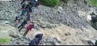 जनपद चमोली में फूलों की घाटी जाने वाले रास्ते पर बना छोटा पुल बहने से कुछ पर्यटकों के फंसे होने की सूचना पर SDRF रेस्क्यू टीम द्वारा तत्काल मौके पर पहुंचकर रेस्क्यू अभियान आरम्भ किया।