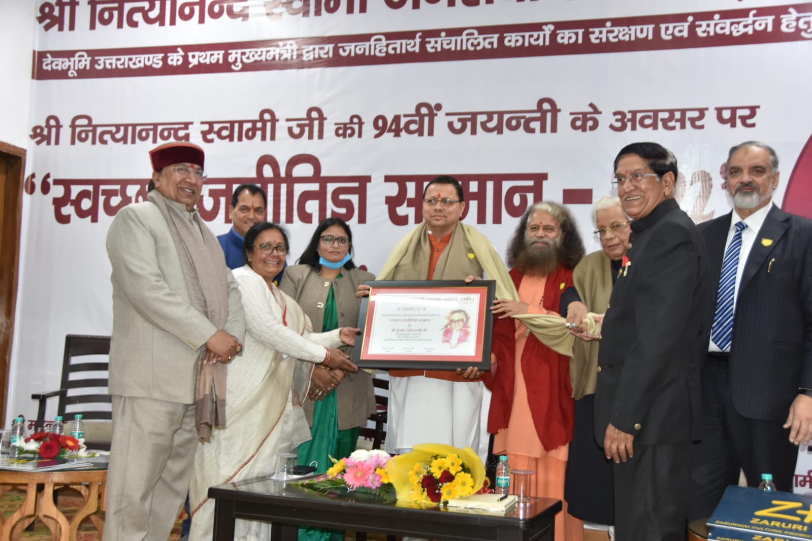 देहरादून :मुख्यमंत्री पुष्कर सिंह धामी को नित्यानंद स्वामी जन सेवा समिति द्वारा आयोजित कार्यक्रम में स्वच्छ राजनीतिज्ञ सम्मान 2022 से सम्मानित किया गया।