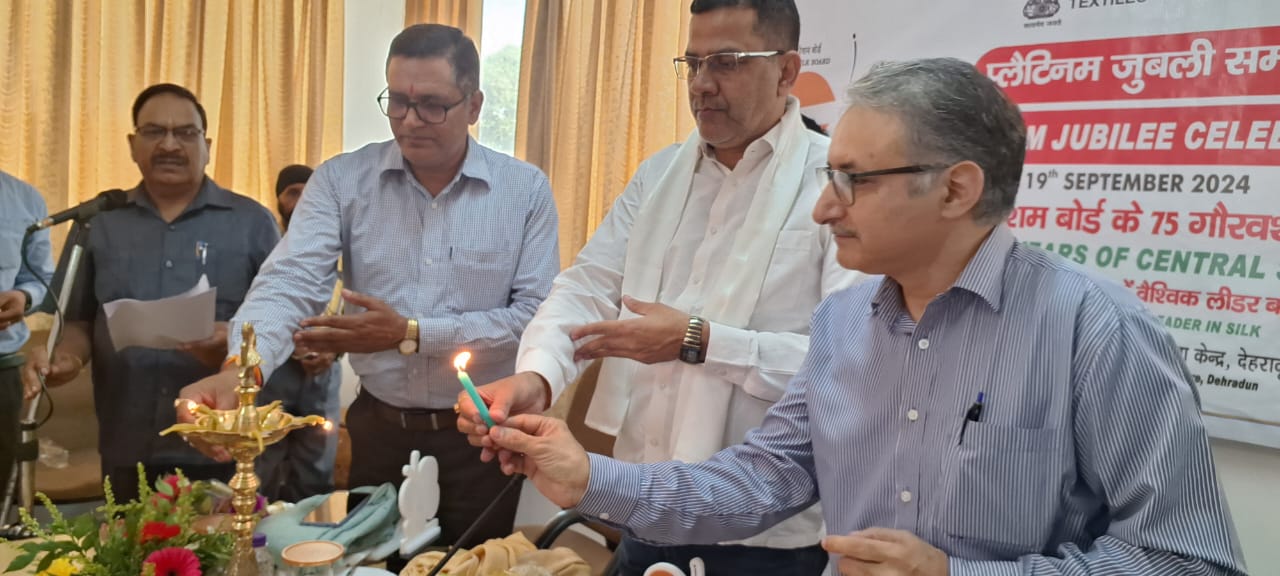 DEHRADUN: केन्द्रीय रेशम बोर्ड की स्थापना के 75 वर्ष पूर्ण होने के उपलक्ष में दिनॉक 19.09.2024 को प्लैटिनम जुबली समारोह के अवसर पर रेशम तकनीकी सेवा केंद्र, प्रेमनगर, देहरादून द्वारा उत्तराखण्ड को-अपरेटिव रेशम फैडरेशन सिल्क पार्क प्रेमनगर, देहरादून के सभागार में सफल लाभार्थियों डिजाइनरों एवम हितधारकों के लिये/रीलर्स / बुनकरों / एक कार्यक्रम आयोजित किया गया है |